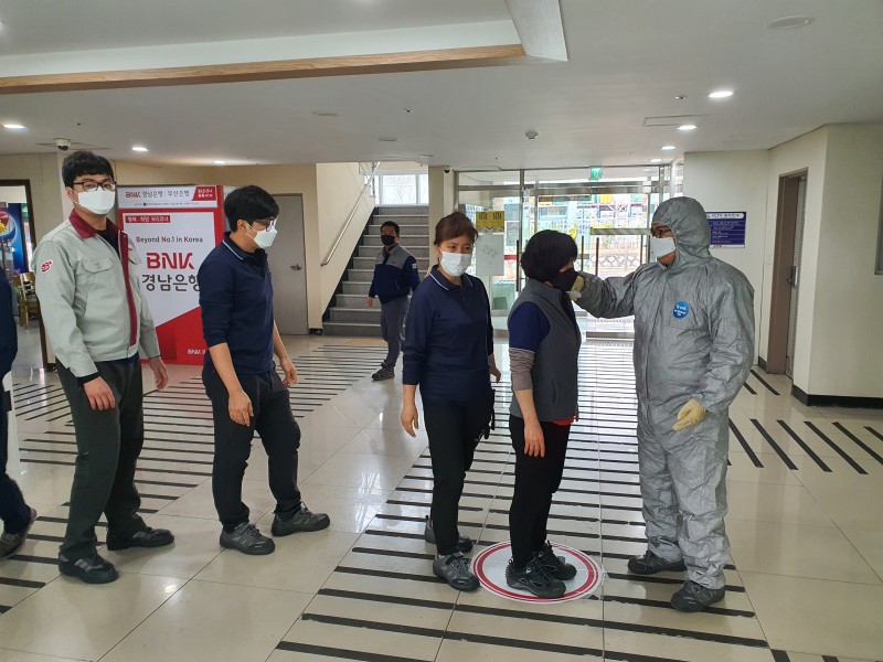为了强化成员们的个人卫生,上班时义务佩戴口罩和测体温。(向所有职员持续供应口罩。)