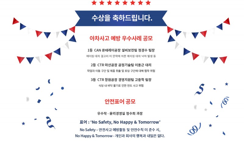 今年的“安全周&安全日”的举办目的是让CENTRAL的所有成员关注安全。其中包含可预防重大事故和事故扩散的“事故征兆预防及改善优秀案例”和可强化安全意识和执行能力的“安全标语”的征集活动。