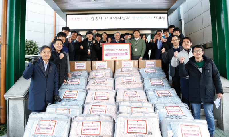 在签约仪式上,CENTRAL将价值500万韩元的冬被捐给独居老人、青少年家长等低收入弱势群体。捐赠物品由20多名高管员工组成的自愿者通过配送服务活动交到了困难邻里的手中。