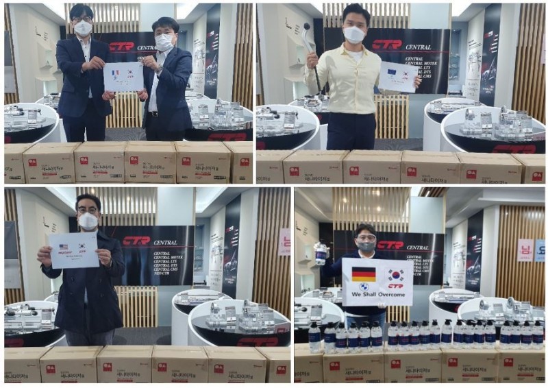 新型冠状病毒肺炎病例剧增和有些工厂的停运给海外顾客带来不少困难,因此CENTRAL营业总部向海外顾客赠送了免洗洗手液包 (Kit)。(洗手液包含有免洗洗手液/承担人图片/加油打气留言)