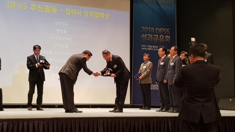 11月7日在现代汽车主办的“2018 DFSS成果分享会”上,技术研究所荣获了相生协力奖。DFSS成果分享会是现代汽车研发本部每年都举办的活动,评选出现代汽车下属企业和合作商的DFSS优秀推进活动进行颁奖,是为了合作商自主进行研发分享支持成果,强化合作的活动。现代汽车为了开展DFSS活动实施“下属企业/合作商MBB (Master Belt Belt)培育及教育”。